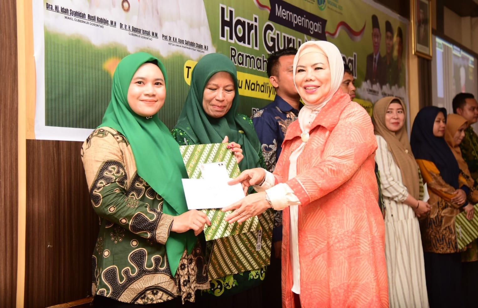 Wakil Gubernur Gorontalo Idah Syahidah Rusli Habibie saat menyerahkan hadiah kepada para pemenang Guru Nahdliyin Award, pada peringatan HGN 2025 yang digelar oleh Persatuan Guru Nahdlatul Ulama (PW Pergunu) Provinsi Gorontalo, bertempat di MAN 1 Kota Gorontalo, Selasa malam (25/11/2025). Foto – Fadly Diskominfotik.