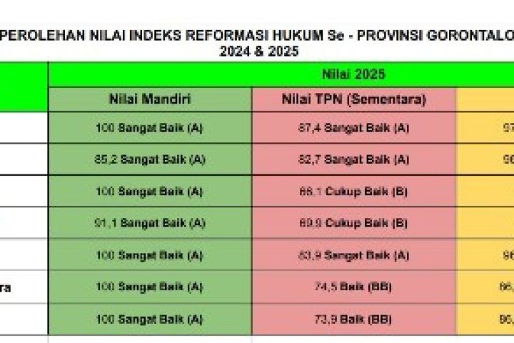 Capaian itu menempatkan Kabupaten Gorontalo sebagai daerah dengan kinerja reformasi hukum terbaik di tingkat regional.