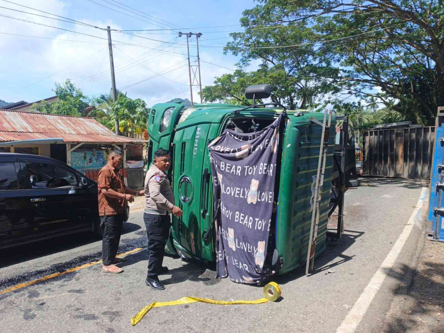 Truk yang dikemudikan RR, warga Desa Sapa Barat, Tenga, Kabupaten Minahasa Selatan, terguling di tikungan kanan saat melaju dari arah Inobonto menuju Kotamobagu.