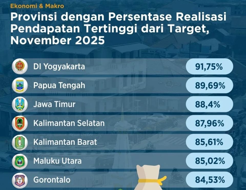 DIGIMEDIA.ID – Berdasarkan laporan Kementerian Dalam Negeri yang dilansir dari databoks.katadata.co.id, realisasi pendapatan seluruh provinsi di Indonesia per 16 November mencapai Rp1.065,55 triliun atau 78,45 persen dari target.