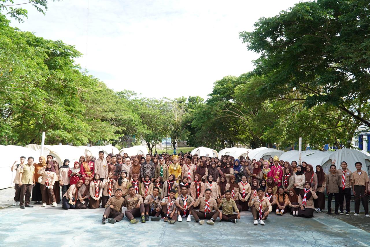 Perkemahan 9 diikuti mahasiswa dari berbagai program studi di FKIP. Warna coklat khas seragam pramuka mendominasi lapangan, menampilkan disiplin dan kekompakan peserta.